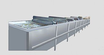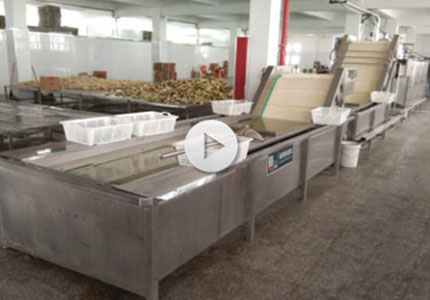 A葉菜類:收菜--分揀輸送--氣泡清洗(粗洗)--氣泡清洗殺菌機--噴淋清洗(凈洗)--風(fēng)干瀝水--包裝輸送。